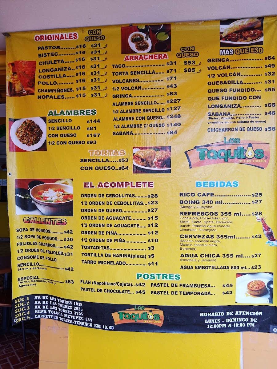 Introducing the menu at Taqueria Los Foquitos de las Torres, located at Blvd. Solidaridad las Torres 921-a in Metepec, is a delightful journey into the heart of authentic Mexican cuisine. Known for its freshly made tacos and signature dishes, this eatery offers a satisfying culinary experience at unbeatably affordable prices. Customers rave about the excellent service and the thoughtful touches, like the convenient bag holders and complimentary mints that enhance your dining experience.